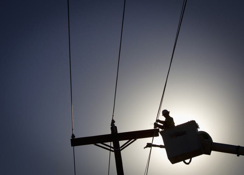 An electrical line technician works on restoring power in Vilonia, Arkansas March 15, 2018 by Stephen Ryan